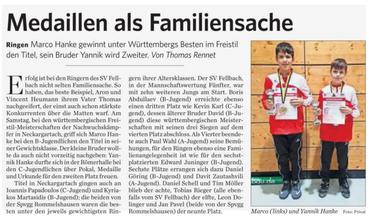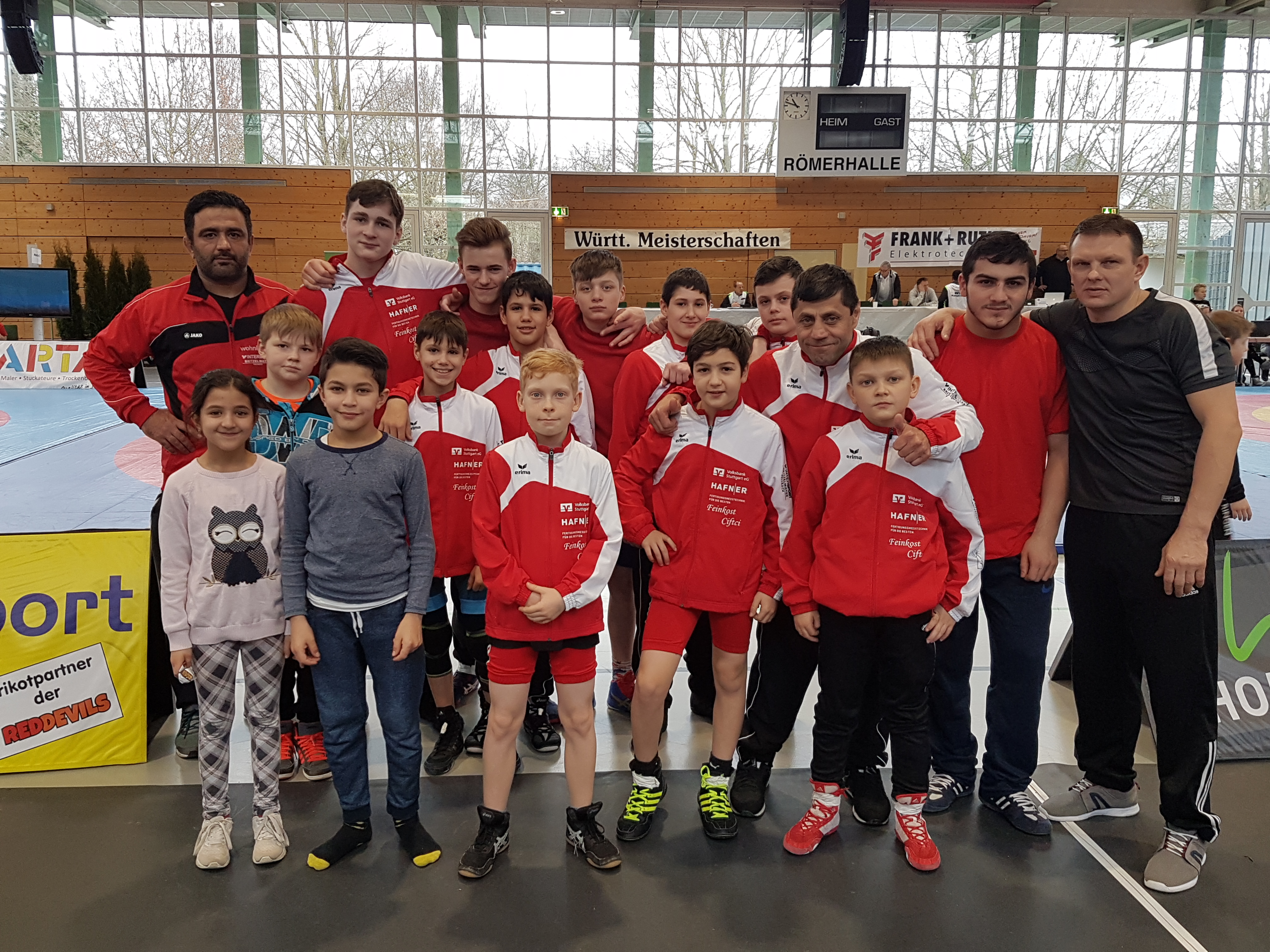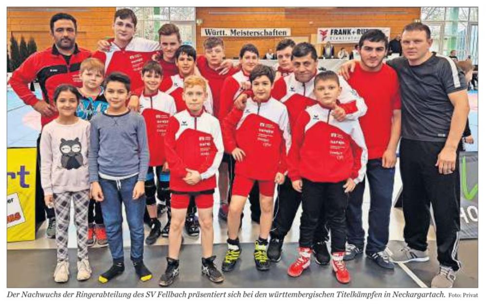 12 SV Fellbach-Jungs starteten am Samstag den 03.02.2018 auf den württembergischen Freistilmeisterschaften. Wiegen war ab 09.00 Uhr jedoch bedingt durch EDV Probleme startete das Turnier leider erst um 12.00 Uhr und die Siegerehrung endete erst weit nach 21.00 Uhr. Teilweise hatten unsere Jungs ihre Finalkämpfe nach 20.00 Uhr was auch mit ausschlaggebend für die Ergebnisse war.