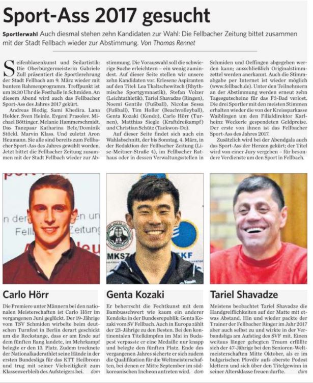 nachdem 2016 Aron Heumann nicht nur zum Sportass nominiert wurde, sondern die Ehrung gewann, ist unser Trainer Tariel Shavadze für 2017 nominiert.